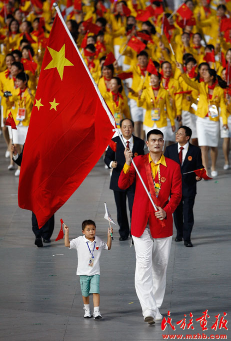 2008年8月8日,全國各族人民期盼已久的第二十九屆奧林匹克運動會在北京隆重開幕,圖為北京奧運會中國代表團入場儀式上,運動員姚明領(lǐng)著汶川大地震中最小的救人英雄林浩入場。《民族畫報》2008年第9期