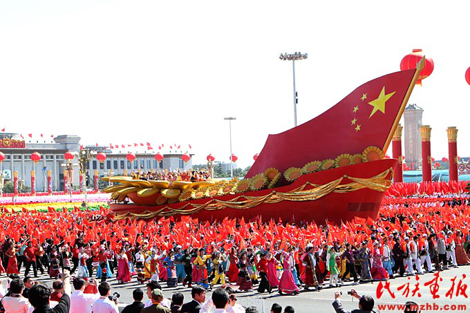 新中國成立以來,黨和國家始終堅持把馬克思主義民族理論同中國民族問題具體實際相結(jié)合,始終堅持把民族工作作為一項重大工作來抓,團結(jié)帶領(lǐng)全國各族人民共同團結(jié)奮斗,共同繁榮發(fā)展,開創(chuàng)了中國特色解決民族問題的正確道路,取得了舉世矚目的成就,積累了彌足珍貴的成功經(jīng)驗。2009年10月1日,在北京天安門廣場,20萬軍民以盛大的閱兵儀式和群眾游行歡慶新中國60華誕,圖為各民族學生參加“團結(jié)奮進”方陣群眾游行?!睹褡瀹媹蟆?009年第10期