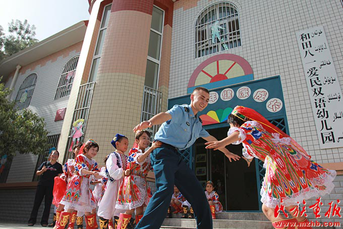 民族團結(jié)是國家統(tǒng)一、繁榮昌盛的前提和保證,各民族“共同團結(jié)奮斗,共同繁榮發(fā)展”是我國民族工作的主題。全國各地扎實開展民族團結(jié)進步創(chuàng)建工作,平等團結(jié)互助和諧的社會主義民族關(guān)系進一步鞏固和發(fā)展。2011年,空軍駐新疆和田某指揮所首次投資80萬元,開辦了和田八一愛民雙語幼兒園,讓30個家庭的孩子進入雙語班成為首批“藍天春蕾兒童”。圖為維吾爾族戰(zhàn)士艾力夏提和該園兒童一起玩老鷹捉小雞游戲。《民族畫報》2011年第11期