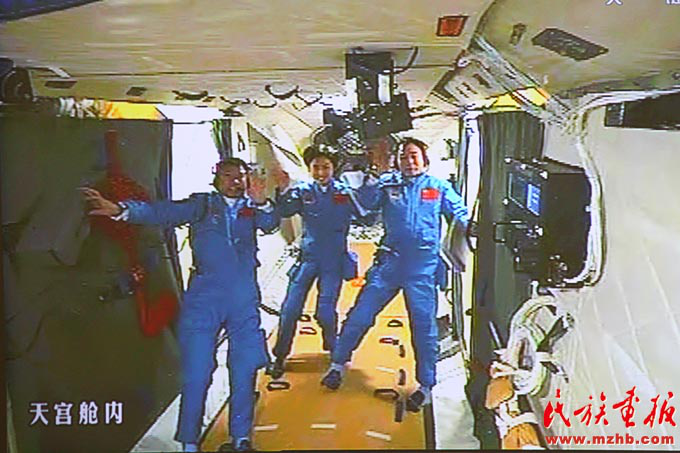 2012年6月18日,神舟九號飛船與天宮一號完成自動交會對接,兩飛行器形成穩(wěn)定運行的組合體后,三位航天員先后進入天宮一號目標飛行器,這實現(xiàn)了中國載人航天歷史上首次對一個在軌運行的航天器的拜訪和駐留。圖為在北京航天飛控中心大屏幕拍攝到的航天員景海鵬、劉旺、劉洋在天宮一號實驗艙內(nèi)的畫面?!睹褡瀹媹蟆?012年第7期