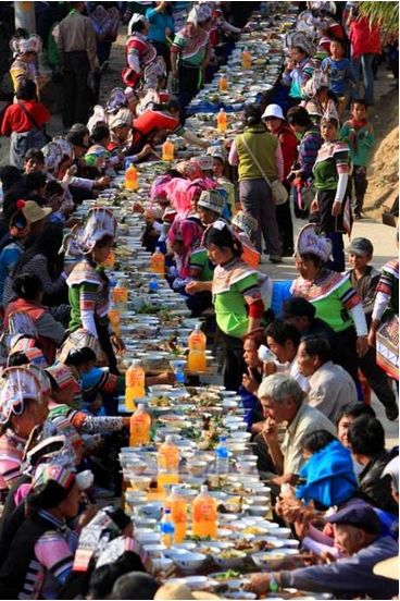 節日期間,哈尼寨子擺起長街宴,哈尼語叫“姿八多”,意為“互相輪流著敬酒”。小寨子擺一次,吃一天,大寨子則要擺兩三次,吃兩三天。每戶做一桌酒菜,抬到寨子街道上擺好,一戶接一戶沿著街道擺成長街宴,八個或十個人自愿結合為一桌暢飲。大寨子分片輪流做東,負責長街宴的酒菜,其他片的人做食客,從早吃到晚,場面十分熱鬧。