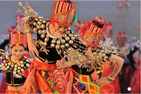 目瑙縱歌節是景頗族最盛大的傳統節日。節日當天,人們身著艷麗的民族服裝相聚一堂,人數少則上千,多則過萬,大家踩著同一個鼓點起舞,規模宏大,有“天堂之舞”“萬人狂歡舞”的美稱。