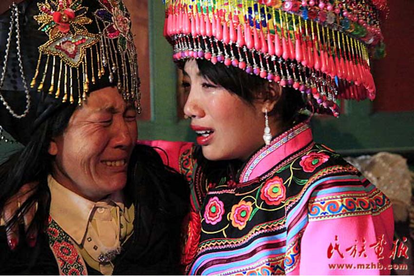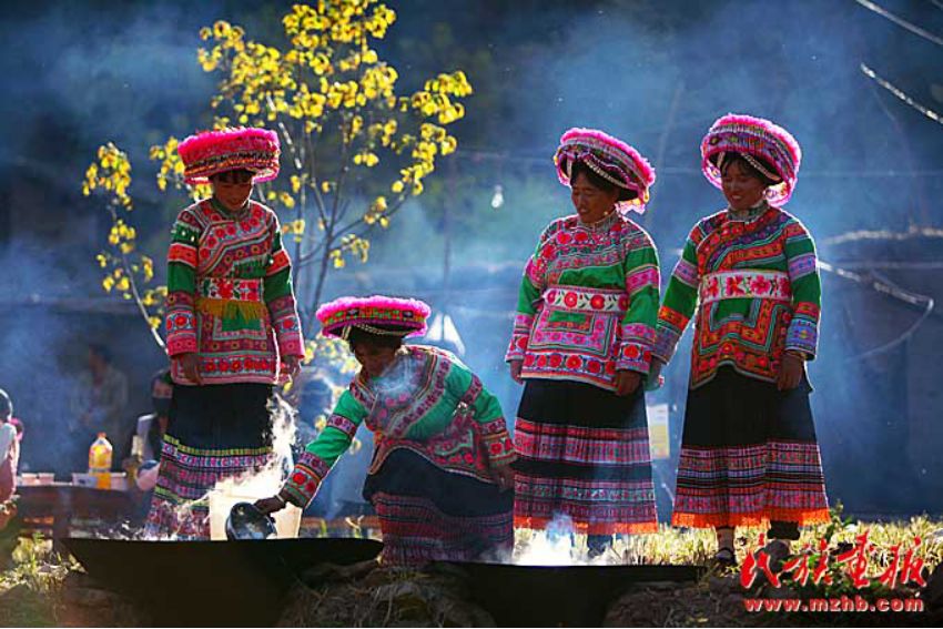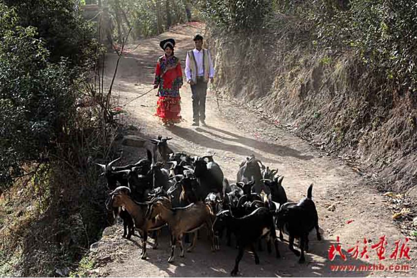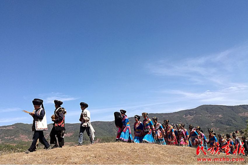 娶親要請客,當?shù)乩圩逭埧椭恍杩陬^傳話,凡是知道的親戚朋友都會來參加。娶親隊伍主次兩位主婚人,伴郎伴娘各一人,背新娘和嫁妝的二人,接親的四至六人,其中有一至兩個歌手,一行十二人組成。帶著早已為新娘準備好的花短衣、長裙、銀手飾、圍腰鏈、銀泡、銀項等飾物興高采烈地從新郎家出發(fā)。