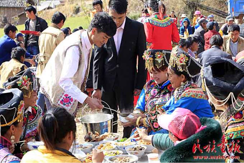 穿長衫,戴著包頭的新郎,把新娘接入正堂屋,將送親的人群迎進臨時搭建的青棚屋休息。青棚,是傈僳族人辦婚事時砍來毛櫟樹、香樹枝等臨時搭起的棚子。既清新又涼爽舒適。可以用來接待賓客,也可以作為跳舞、唱曲子的活動場所。晚餐就在青棚里進行,宴席一般不用桌子,酒菜擺在青棚下面鋪好青松毛的地上,客人八個一圈,席地坐在青松毛上,圍著喜筵,既歡樂又開心的喝著美酒、品嘗佳肴。晚飯菜肴十分豐盛,足見主人家的好客和廚師的高超手藝。菜出雙不出單,菜的顏色出紅不出白。一切都象征著成雙成對,吉祥如意。