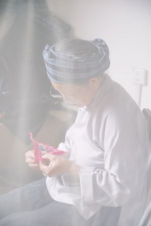 對(duì)制衣人來(lái)說(shuō),她們?nèi)缗e行儀式般專注著染布、成衣,或許也在這個(gè)過(guò)程中積攢起許多專注和深情。一位有十幾年經(jīng)驗(yàn)的阿姐曾告訴我:“做這衣服要有一顆溫柔的心。”聽(tīng)時(shí)深深一顫,而用黃奶奶樸素的話,則是“染布高興”。