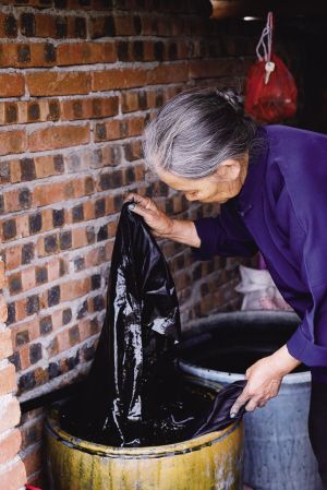 黃奶奶帶我去看她染布的地方,屋頂一間小小的屋子里擺了三個(gè)大缸,還沒(méi)走近就聞到濃烈的藍(lán)靛發(fā)酵所產(chǎn)生的獨(dú)特氣味。染缸用厚厚的布蓋著,如同黃奶奶的秘密寶箱,要掀開(kāi)才能看到里面深色的液體。“今天不成,下次染布給你看。”她看了看液體表面,也沒(méi)多說(shuō),似乎染缸有它自己的節(jié)奏。