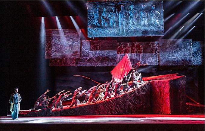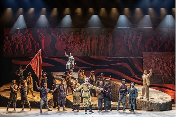 在舞蹈語言的設計上,編導融入當代元素,使觀眾不但感受到審美的親切與現代感,而且還自然地進入回望歷史的情境,對其思想內涵的理解更為準確。該劇的道具使用和調度也頗為大氣,令人印象深刻。一組斜坡狀的大型舞臺道具不但由群眾演員直接移動而實現即時的場景調度,還可使演員上下和左右而行,最終組合成巨大的中國共產黨黨徽,輔助完成了人民英靈和英雄的形象塑造。