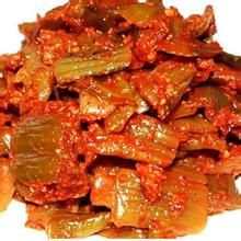 把鹽漬好的青菜削去老葉、粗皮,用甜酒、糖拌勻,再按比例加入蒜苗、蒜頭、辣椒粉、冰糖、食鹽和適量白酒,調好后分壇包裝,密封貯存。約兩個月后即可出廠銷售。