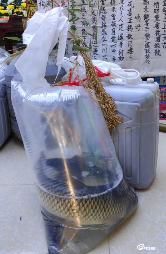 忘記密碼?這幅圖片拍攝于都勻殯儀館,是在一位水族干部的葬禮上,三都水族自治縣九阡鎮(zhèn)的內(nèi)侄們從家鄉(xiāng)趕來憑吊姑父時,送來了三條大活魚、一頭小豬、一壺米酒等物。水族有忌葷不忌魚的習(xí)俗,內(nèi)侄送魚表示與表兄弟姊妹一道忌葷,共同戴孝,共同守制;送來的小豬為堂祭犧牲,祭奠亡人。
