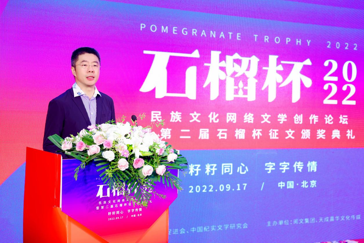 2022年9月17日,民族文化網絡文學創作論壇暨第二屆石榴杯征文頒獎活動在民族文化宮舉行。本次活動得到了國家民委所屬中國少數民族文化藝術促進會和中國紀實文學研究會的指導與支持,由閱文集團、北京天成嘉華文化傳媒主辦,天成達星國際傳媒承辦。