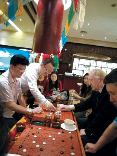 阿旺邊巴(左一)與外國藏棋研究學(xué)者交流藏棋文化。