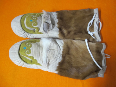 簡介:現收藏于民族文化宮博物館的這副狍皮手套,是鄂倫春民族冬季狩獵時必備的傳統服飾之一。該手套拇指與四指分開,四指部分連成一體,按手型呈尖圓狀,拇指和四指相對,且在拇指端手心面開一橫口。手套通長48厘米、套口周長40厘米、手套寬13厘米、拇指套長8厘米,套口處穿有一可收縮白色帶子。[詳細]