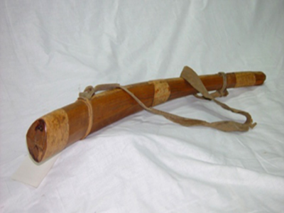 簡介:鄂溫克族牛角形帶箍木質鹿哨,長71厘米,紅松木質地,1946年制作,鄂溫克族傳統擬聲狩獵工具,也作為樂器。征集于內蒙古自治區喀爾古納左旗,藏于民族文化宮博物館。鹿哨是中國北方及東北亞狩獵經濟文化類型的重要實物遺存,有鮮明民族與地域特色。[詳細]