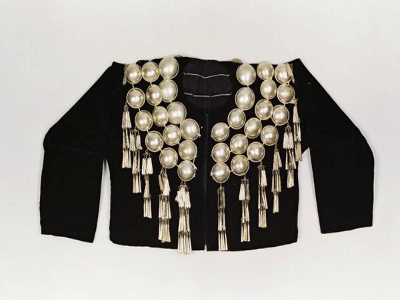 簡介:民族文化宮博物館收藏的這件銀飾“孔雀衣”,是景頗族女子盛裝時的一種服飾,征集于云南省德宏傣族景頗族自治州隴川縣,時間為20世紀50年代。這件銀飾“孔雀衣”長40厘米,胸圍108厘米,黑色平絨布制作而成,圓領對襟,領部、肩部和胸部墜銀泡、銀鏈、銀穗裝飾,黑白兩色相映成趣,精致華美。[詳細]