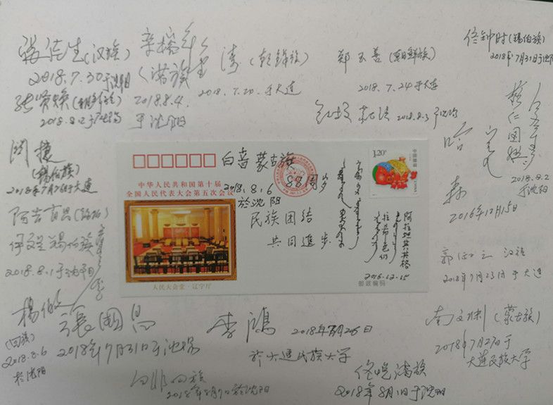 在采集口述影像錄音資料的同時,項目組還收集了大量的珍貴歷史照片以及相關文物。值得一提的是,他們設計了一種非常有特色的受訪者簽名簿,中間貼著繪有56個民族的音樂舞蹈圖案的首日封或明信片,四周簽上受訪者的人名簽名字、民族特征,有些還用民族文字書寫,體現了中華各民族團結在一起的精神風貌。簽名簿有厚厚的幾大本,設計精美,承載著民族工作口述史資源采集的經歷,具有豐富的文化內涵和博物館收藏價值。