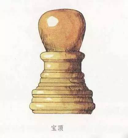 在建筑物的頂部中心位置,尤其是攢尖式屋頂的頂尖處,往往立有一個圓形或近似圓形之類的裝飾,它被稱為寶頂。在一些等級較高的建筑中,或者確切地說,在皇家建筑中,寶頂大多為銅質鎏金材料制成,光彩奪目。
