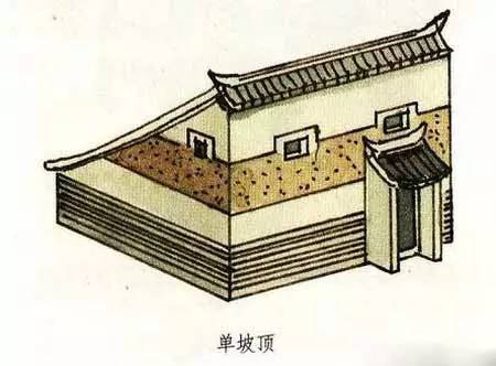 單坡頂就是只有一面坡的屋頂。它與我們常見的兩面坡屋頂有較大的不同,但從一面來看又有極大的相似性。我們甚至可以說,單坡屋頂就像是兩面坡屋頂被從中間一切兩半了。單片屋頂一般都用在不太重要的建筑或是附屬性的建筑上。在已發掘的商代宮殿遺址中,可以看到在商代即有單坡頂的廊子了。而現在的陜西、陜西等地的農村,許多民居仍然使用單坡式的屋頂,成為現今較富有特色的一種民居形式。