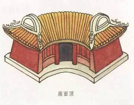 扇面頂和萬字頂一樣,是一種非常別致的屋頂形式,扇面頂顧名思義,就是扇面形狀的屋頂形式,其最大特點就是前后檐線呈弧形,弧線一般是前短后長,即建筑的后檐大于前檐。建筑的西山墻的墻線若向內延伸,可以交于一點,而這一點就是扇形的扇子柄端。扇面頂的兩端可以做成歇山、懸山,也可做成卷棚形式。扇面頂一般都用在形體較小的建筑中,會讓建筑看起來更為小巧可愛。