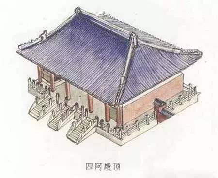 四阿殿頂也就是廡殿頂。四阿殿頂也是宋式叫法。“阿”是建筑屋頂的曲檐,“四阿”就是四面坡式的曲檐屋頂。廡殿頂共有五條脊、四面坡,所以叫做四阿殿頂。