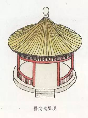 攢尖式屋頂沒有正脊,而只有垂脊,垂脊的多少根據實際建筑需要而定,一般雙數的居多,而單數的較少。如,有三條脊的、有四條脊的、有六條脊的、有八條脊的,分別稱為三角攢尖頂、四角攢尖頂、六角攢尖頂、八角攢尖頂等。此外,還有一種圓形攢尖頂式,也就是沒有垂脊。