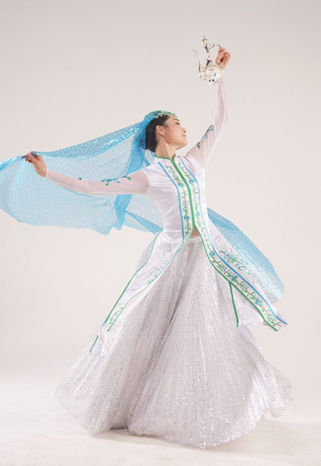 “湯瓶舞”流傳于寧夏回族自治區。舞者持白毛巾為道具,表現伊斯蘭教禮拜前用“湯瓶”(壺)盛水凈身之習俗。舞蹈中還常出現模擬“湯瓶”的形象,故有此名。舞蹈有“擦身”“搓背”以及揮舞毛巾互相抽打、嘻戲等動作(圖為手持湯瓶道具,表演回族舞蹈, 舞者娟子本人提供)。
