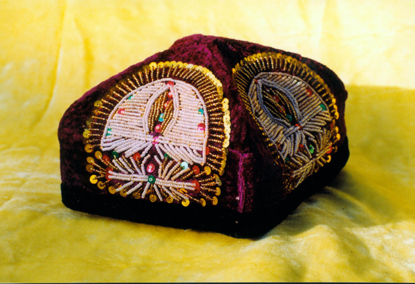 此外,維吾爾族花帽更是具有濃重的維吾爾特色,男女均可佩戴。古代人們佩戴花帽主要用于抵御風寒,現代維吾爾人佩戴各類花帽則主要起到裝飾作用。維吾爾花帽造型多樣,其圖案花紋也各有不同,主要有以下幾類:巴旦姆花帽、塔什干花帽、格來木花帽、曼波爾花帽、奇曼花帽、再爾花帽、瑪日江朵帕、金片花帽、吐魯番花帽、伊犁花帽、夏帕克帽、賽里甫西吐瑪克。