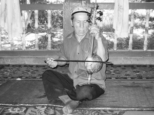 剛下車,就聽見平房里傳來了蒼涼、沙啞、如泣如訴的琴聲和悠揚的歌聲。這就是艾捷克的聲音嗎?簡直叫人心顫!我感嘆著,回頭問同行的翻譯薩達提·瓦依提。他仔細聽了聽,笑道:“這是艾捷克演奏的《青牡丹夏爾瓦努》!”“難怪這么深情婉轉。”我恍然大悟。