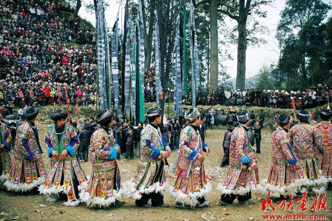 苗族春節(jié)是以農(nóng)歷正月初一為歲首的漢族和其他少數(shù)民族共同歡度的傳統(tǒng)節(jié)日。在黔東南的苗族,把春節(jié)叫做“漢年”(niangxdiel)與傳統(tǒng)的“苗年”(niangxhmub)并存,和其他民族一共同歡度,尤其是那些不過苗年的苗族地區(qū),主要是過春節(jié),但不及苗族過苗年隆重,識(shí)漢字的苗族也貼些對(duì)聯(lián)、門神之類,其余與過苗年相同,即增加了斗牛、賽馬、走親訪友以及男女青年“游方”、對(duì)歌等民族特色的內(nèi)容。有的人家的男婚女嫁也選在春節(jié)舉行。湘西地區(qū)的苗族過春節(jié),還舉行規(guī)模盛大的“趕牛場(chǎng)”活動(dòng);廣西融水縣一帶的苗族過春節(jié),舉行蘆笙舞會(huì),每年群眾竟達(dá)數(shù)萬(wàn)人之多。