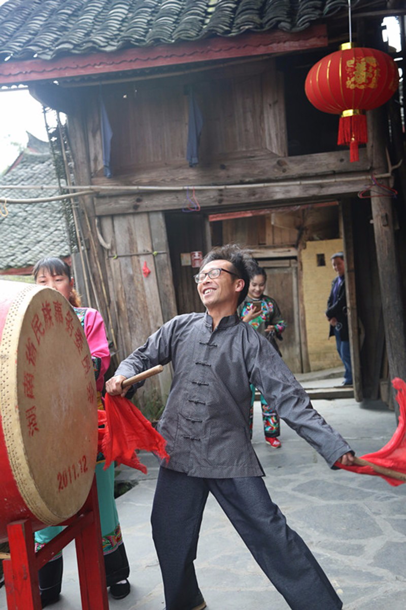 在“幸福人家”客棧門前,楊超文與妻子神采飛揚地敲響了苗鼓