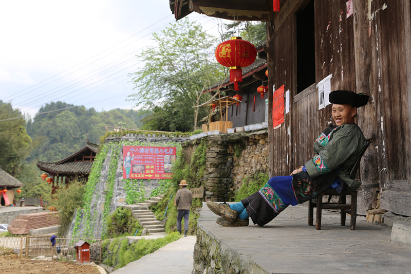 石拔三大媽的家位于村口,老人正在院子里曬太陽。這里的苗族習俗保持得很好,村民日常生活中大多是苗族傳統打扮。大媽頭裹黑帕頭、穿一件綠色繡花苗裝,利落得很。見來了客人,她趕緊把我往屋里讓。