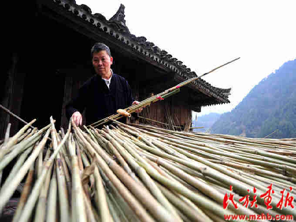 今年63歲的苗族漢子莫厭學(xué)是排卡村一名擁有國(guó)家級(jí)非物質(zhì)文化遺產(chǎn)第一批傳統(tǒng)手工技藝傳承人稱號(hào)的藝師,他出生在一戶已經(jīng)五世相傳的蘆笙制作世家,從16歲起就跟隨父親制作蘆笙,47年來(lái),他從未中斷過(guò)蘆笙制作,從他手中制作出來(lái)的蘆笙音質(zhì)圓潤(rùn)、做工精湛,素雅光滑,玲瓏精巧。他認(rèn)為,蘆笙不僅是一件樂(lè)器,它奏出的音調(diào)是語(yǔ)義性的,也就是“蘆笙是會(huì)說(shuō)話的”。苗家人通過(guò)蘆笙吹奏,借樂(lè)器來(lái)言情志事,傳達(dá)明確的語(yǔ)義。2006年莫厭學(xué)獲得了“貴州省十大民間工藝大師”稱號(hào)。