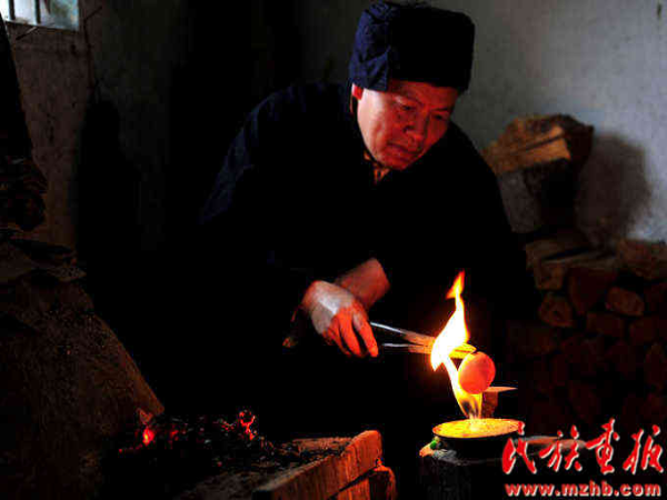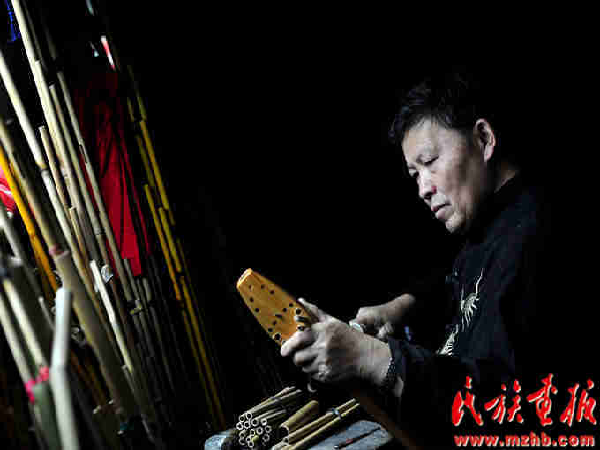 莫師傅在對(duì)兩個(gè)蘆笙進(jìn)行高低音的和諧調(diào)試