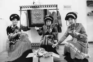 喬進雙梅(左一)和當地的彝族繡娘們一起交流刺繡技藝。