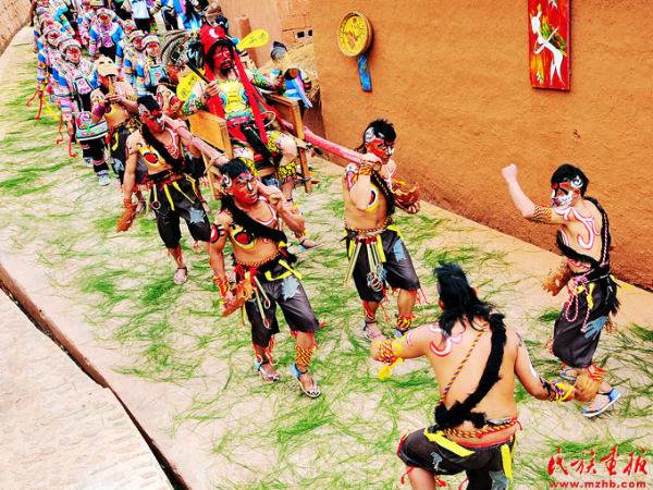 恭請大啞巴的儀式上,羅支全部到齊。羅支就是眾老啞巴,為首的被稱為畢摩。彩繪時,以不同的圖案分別繪在臉部的右上方作為家族和輩分區別。儀式上,六位畢摩在護衛總管的護衛下,依次點香叩首。畢摩大聲喊“請啞巴出山嘍”。然后四個壯實的中啞巴用扎好的彩轎抬著大啞巴游街,其余啞巴打歌跟在后面。最為活躍的是畢摩的跟幫,也稱為“馬彷”,他們以倒退的方式,邊跳邊引導行進的隊伍。啞巴隊從村頭到村尾,通過祭拜龍樹、祭鼓,經過“三請三唱三起號”,將大啞巴請到廣場,隨后開始了具有濃厚文化底蘊的啞巴舞表演。