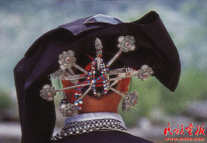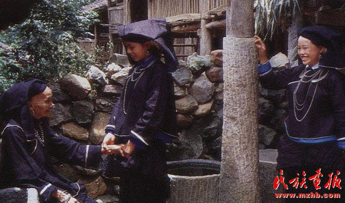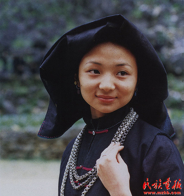 婦女的服飾更具特點,無論老少,都喜歡穿右蓋大襟和葫蘆狀矮腳圓領的緊身短式上衣,下身以寬褲腳、大褲頭的褲子相搭配,腰系黑布做成的大圍裙,頭帶黑布大頭巾。其圍裙既寬且長,戴時能系周身有余,裙底垂掛到小腿下部,圍裙不僅作為裝飾,而且可以作為勞動工具,遇趕圩或走親訪友和勞動時,可將圍裙底翻卷上來作成小包袱,用以包裝和盛裝物品。婦女頭巾都是一塊自己紡織染成的長條黑布,戴時先圍繞在頭上,然后翻折擺布成火棱形的圖樣,罩在整個頭上,再把頭巾的兩端分別垂掛到雙肩上,看上去樸素美觀。同時還可以當做帽子遮蔭用。她們的衣邊、衣角、袖口、裙邊和頭巾的四邊都用紅布或黃布剪成小條以后鑲捆上去,有的則用紅、黃、藍色絲線繡成波浪形的線條,使黑中襯出紅、黃、藍色的線條來,清雅明亮,色彩協調。再加上頭發插著龍頭形的銀簪,頸項上帶有銀鏈或項圈,手帶銀圈、玉鐲,耳掛珍珠耳環等,使人一看,黑中閃艷,樸素之中亦有玲瓏之美,表現了她們獨特的審美觀。