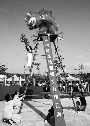 獅子過天橋、刀尖獅技、高樁飛獅……一只只威風凜凜的“獅子”在高臺或梅花樁上騰挪跳躍,它們時而回首擺尾,時而單腿直立,時而臥居山川,時而沖向九霄,甚至還會沖觀眾眨眼吐舌,憨態可掬,惟妙惟肖。整個場面既驚險又有趣,讓大批駐足觀看的游客大開眼界……