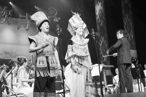 廣西戲劇院成立一年來(lái),承擔(dān)起壯劇、桂劇、彩調(diào)劇3個(gè)國(guó)家級(jí)非物質(zhì)文化遺產(chǎn)劇目和京劇國(guó)粹藝術(shù)的傳承、保護(hù)、發(fā)展重任,不斷推出具有“美麗廣西、壯鄉(xiāng)風(fēng)格、時(shí)代特征、和諧兼容”的舞臺(tái)藝術(shù)精品,此次推出的《壯族詩(shī)情》便是其中之一。《壯族詩(shī)情》共分“地鼓”、“天歌”、“水秀”、“山雄”4個(gè)章節(jié),以150多名演職員的演出陣容,通過合唱、獨(dú)唱以及民族器樂演奏的形式,如詩(shī)如畫地描述了廣西壯族的風(fēng)土人情,突出了“美麗廣西”時(shí)代主旋律。圖為《壯族詩(shī)情》演出現(xiàn)場(chǎng)。