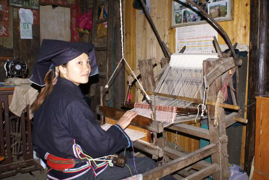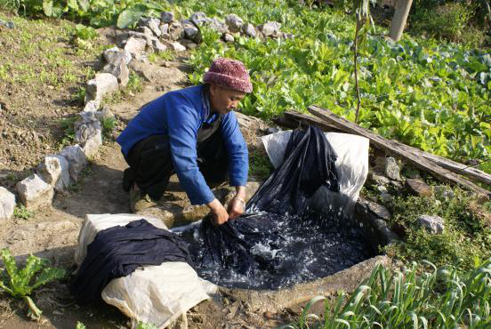 從前壯族鄉村,普遍掌握制作藍靛及印染方法。一般置一大缸,將藍草放入浸泡,加石灰使之分解、發酵,經過化學變化,而后濾去殘渣,蒸發水分,凝成糊狀藍色染料。其間需不斷攪動,使色素充分化解。“每靛草六百斤,造成一百斤之靛為佳。”因產量較多,遠銷廣東。浸染時,將適量靛糊化于染缸中,同時將雞血藤搗碎加入。布要反復浸泡多次,晾泡結合,直到染為深藍色。其間雞血藤釋放出一種紫紅色的植物膠,將藍靛色素粘在纖維上,是色素耐水耐腐耐紫外線,不易褪色,并有若隱若現的亮點,結實美觀。這個過程,運用了化學分解法。