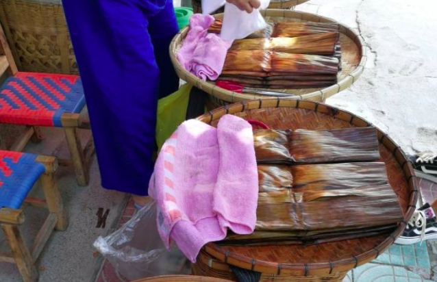 褡褳粑是布依族人民喜愛的傳統食品,因其如褡褳袋而得名。每逢農歷七月十五日(中元節),布衣族人民均普遍制作褡褳粑,作為祭祀祖先的供品。相傳兩千多年前,祭祖是用當地盛產的芭蕉果和普通糍粑,后來發展為用芭蕉和糯米蒸熟,加上紅糖,制成甜味糍粑。又經過多次改進才形成現在的褡褳粑。如今,除七月十五日以外,逢年過節,宴客,走親訪友,也要制作褡褳粑。蒸熟后的褡褳粑呈長方形,色澤醬黃,香甜細膩,具有芭蕉果和芭蕉葉的特殊香味。熱吃軟滑細膩,冷吃清涼甜潤,烙食香脆。
