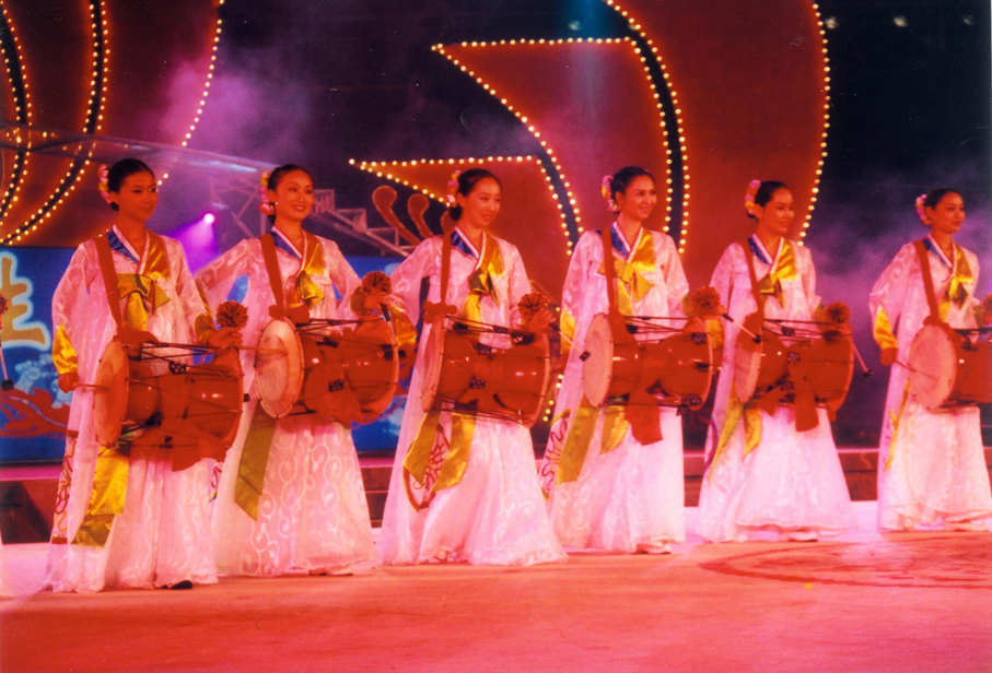 扇舞:表演者多為女性,需持花扇表演。源于古代巫女活動及民俗活動中的扇子表演,后發展成為單扇舞、雙扇舞兩種形式。扇舞有持一把或兩把扇具的不同形式,它具有朝鮮族特有的節奏、含而不露的內在情緒、曲線性的律動和自由自在的表演,隨著隊形的不斷變化,舞者將手中的扇具可組合成豐富多樣的圖案和造型。