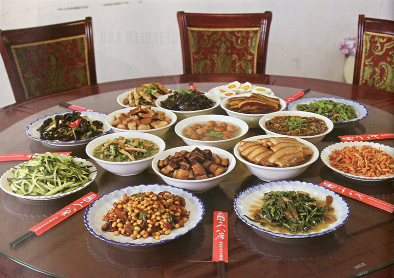 “二八席,八個盤、八個碗,八盤涼菜、八碗熱菜,講究葷素搭配,涼菜以時令蔬菜為主,可隨季節(jié)自由搭配,熱菜相對固定,即為紅木梳背和白木梳背、紅剪子和白剪子。”李鳳友像說順口溜一樣道出了二八席的基本構(gòu)成。