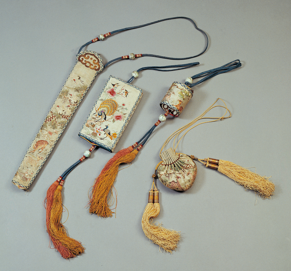 滿族服飾色彩多以淡雅的白色、藍(lán)紫色為主,紅、粉、淡黃、黑等色也是其服飾的常用色。白色在滿族服飾中是一個(gè)重要的顏色,因?yàn)椋瑵M族傳統(tǒng)上有尚白習(xí)俗,以白色為潔、為貴,白色象征著吉祥如意,所以,在滿族服飾中常在紅色、藍(lán)色等其他顏色的旗袍上鑲白色的花邊。滿族男女都喜愛在腰間或衣服的大襟上掛佩飾。男子有火鐮、耳勺、牙簽、眼鏡盒、扇帶。滿族女子喜歡盤頭翅,梳兩把頭或旗髻,戴耳環(huán)、手鐲、戒指、頭簪、大絨花和鬢花等各種裝飾品。擅長刺繡,她們?cè)谝陆蟆⑿妗⑾隳摇⒑砂⒄眍^等物品上刺繡花卉、芳草、鶴鹿、龍鳳等吉祥圖案(圖為滿族清代繡花湖色緞佩飾,中央民族大學(xué)民族博物館館藏)。