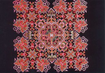侗族刺繡工藝流行于湘、桂、黔三省交界處的侗族聚居區。圖案紋樣多取材于自然景物,如花、鳥、魚、蟲之類。畫面生動活潑,色彩明麗。