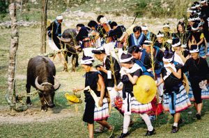 白褲瑤的喪葬習俗十分獨特,整個葬禮悲壯、肅穆,氣氛凝重莊嚴。參加葬禮的親友依次排隊順時針繞牛一圈,緬懷逝去的親人。2007年10月拍攝。