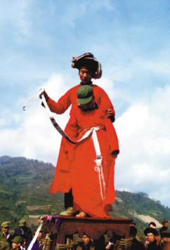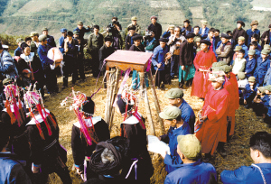 受戒儀式前前后后要舉行好幾天,一般依照受戒者家的經濟條件來定。時間短的叫“小辦”,時間長的稱“大辦”。但其中有一條,不論時間長短,度戒中的規矩是不能違背的。這次十幾位受戒者合起來辦的度戒,聽說是七天七夜的“大辦”。在這幾天中,受戒者必須嚴禁會客、社交、唱歌等,只能低頭修身養性,吃清淡無油的飯和水。度戒中最重要的一件事是聘請師父,有“度師”和“度道”之分,師傅自然有“師公”和“道公” 之分。師宗縣藍靛瑤中的度師為武戒,師公要負責“五臺” 受戒儀式。度道為文戒,道公身穿紅色法衣,負責念經求神等儀式。受戒祭師一般由德高望重的長者擔任,他們是寨中一切主要事務的決策者,也是寨中最有學問的人。在受戒儀式中,他們要對弟子進行族史、族規、社會道德等多方面的教育。