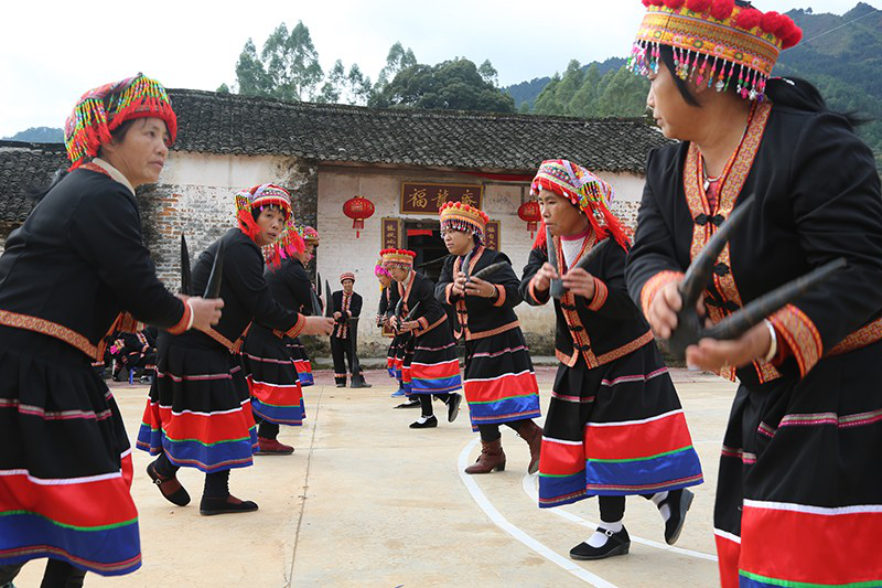 從舞者的動作中,我們不難發現,扮演山羊的演員動作大多是圍繞長鼓設計的。歷經千百年的演變,羊角長鼓舞已發展為集歌、樂、舞于一體的民間舞蹈,主要表現盤王及其子孫開辟瑤鄉的勤勞勇敢。瑤家人建房、祝壽、結婚生子、慶賀豐收以及祭祀等都要表演長鼓舞。每逢過大年、盤王節、耍歌堂等傳統節日,更是少不了這套讓人耳目一新的舞蹈。