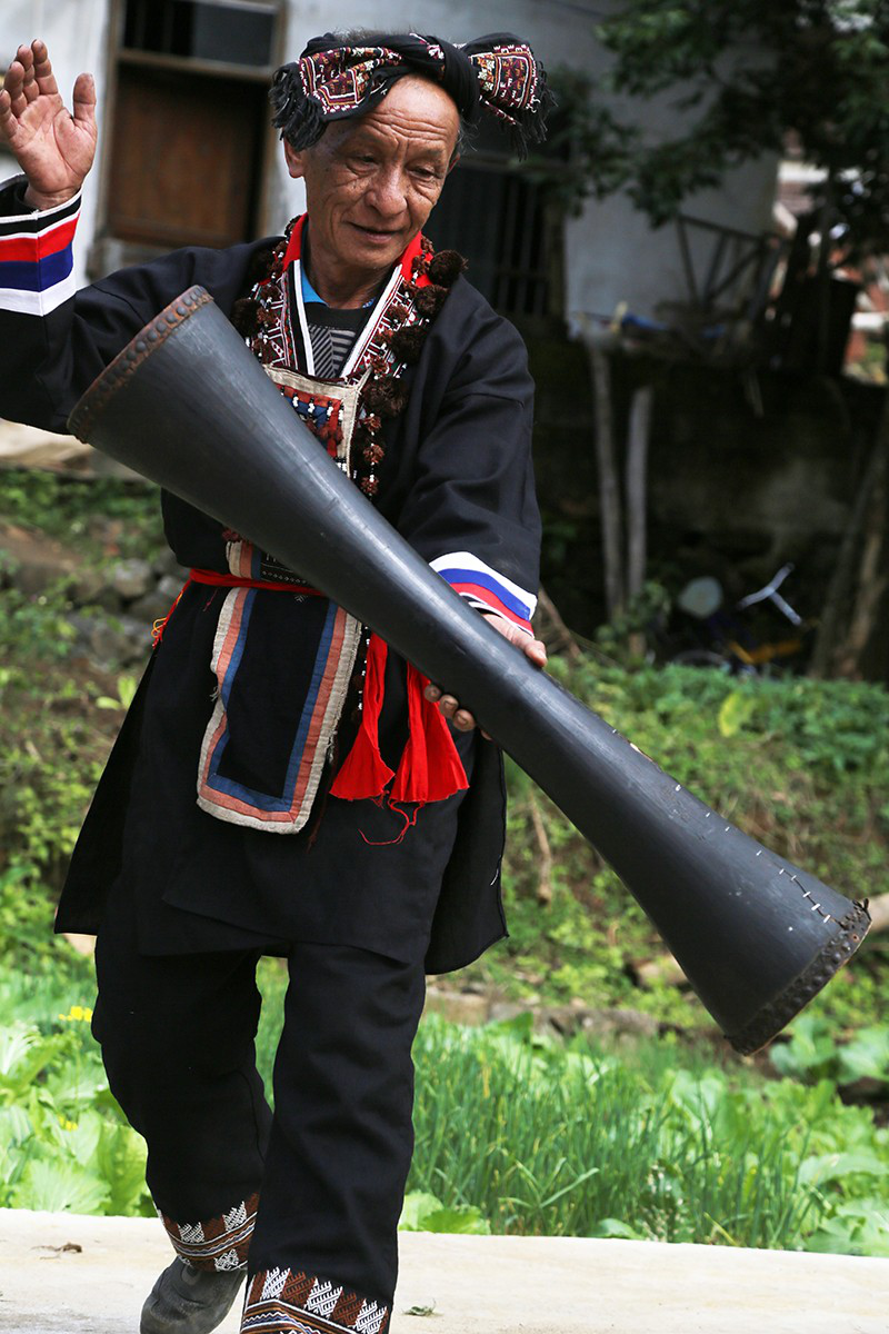 聽罷門唻歌,再賞羊角長鼓舞。轉鼓、跨步、收腿、回腰、碰角……這套由多人合作的舞蹈,動作粗獷,節奏明快,舞者配合默契,音韻鏗鏘。今年66歲的老藝人盤福貴,舞起祖宗留下來的已有一百多年歷史的羊皮長鼓,身手矯健、動作敏捷,讓人驚嘆不已。盤福貴的爺爺、父親都是跳羊角長鼓舞的高手,父親把這項技藝傳授給他,如今他又收女兒和孫子為徒,已是五代傳承了。