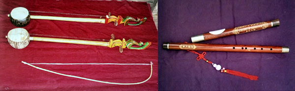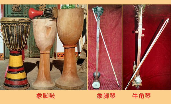 傣劇是在傣族民間歌曲和歌舞音樂的基礎上發展起來的,并借鑒了漢族戲曲藝術的表現手段,流傳于德宏、保山、臨滄等傣族聚居區。傣劇包括多種男女唱腔,男腔多用羽調式,女腔多用徵調式。20世紀50年代以來,傣劇吸收了多種傣族民歌和舞曲,豐富了唱腔,增強了音樂的表現力。傣劇唱腔基本是上下句組成的樂段及其變化反復。由于唱詞字數可多可少,因此唱腔樂句長短不一。過去,傣劇只用小堂鼓、鑼、镲等伴奏,后逐步采用了多種民族樂器及西洋管弦樂器,組成新型的傣劇樂隊。傣族的民族樂器屬于吹奏樂器的有篳、葫蘆簫(如圖)、豎笛、木葉等;彈撥樂器有玎琴、口弦等;弓弦樂器有西玎(玎琴)、牛角玎(牛角琴)等;打擊樂器有象腳鼓、光隆、光邊、光邦、鑼、镲等。象腳鼓、鑼、镲的合奏是傣族器樂合奏的主要形式。