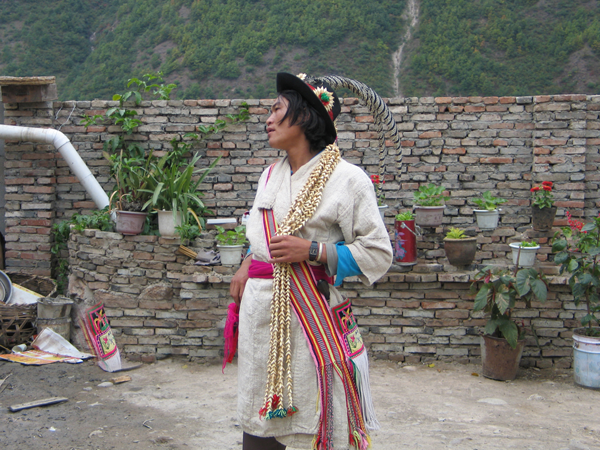 傈僳族男子的服飾各地基本相同、略有區(qū)別,如四川地區(qū)的傈僳男子用黑布包頭,身穿條紋麻布衫褲;云南德宏地區(qū)則頭包黑布,身著無領、無扣的有衽麻布長衫,外罩上灰下黑的小坎肩,前襟無扣,而怒江地區(qū)的傈僳族一般為黑布或紅布、藍布包頭,身著麻布長衫(夏天穿短衫),褲寬大,長至膝下,上開大襟、無扣,腰系線織布帶等。