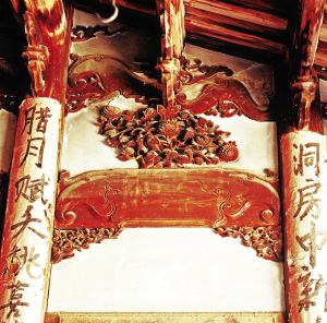 畬族的古老民居都是深宅大院,堂屋高大、寬敞,也是裝飾的重點,神龕、窗欞都有鏤空木雕和浮雕裝飾。堂屋依木柱用木板隔間,板壁上露出半圓的木柱,在對應的木柱上貼著紅紙濃墨的對聯——每逢新婚、祝壽、春節等重大節慶都要貼對聯。